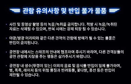본 공연은 사진, 동영상 촬영, 녹음, 녹취와 SNS를 통한 생중계를 금지하고 있습니다. 그리고 관람에 방해되는 물품(야광, 발광 머리띠 등)은 반입이 금지됩니다!