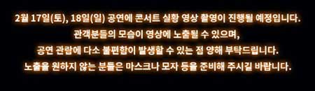 2월 17일(토), 18일(일) 공연에 콘서트 실황 영상 촬영이 진행될 예정입니다. 관객분들의 모습이 영상에 노출될 수 있으며, 공연 관람에 다소 불편함이 발생할 수 있는 점 유의하여 주세요. 노출을 원하지 않는 분들은 마스크나 모자 등을 준비해 주시면 좋을 것 같습니다.