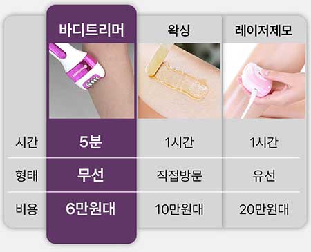 - 제모 방식: 혼바디 바디트리머는 족집게 제모 방식을 사용합니다. 면도날 제모 방식에 비해 통증이 적고 모근 제모가 가능하지만, 제모 시간이 다소 오래 걸릴 수 있습니다.