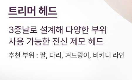 - 3 in 1 멀티 헤드: 팔, 다리, 겨드랑이, bikin이 라인 등 다양한 부위에 사용할 수 있는 3가지 헤드가 제공됩니다.